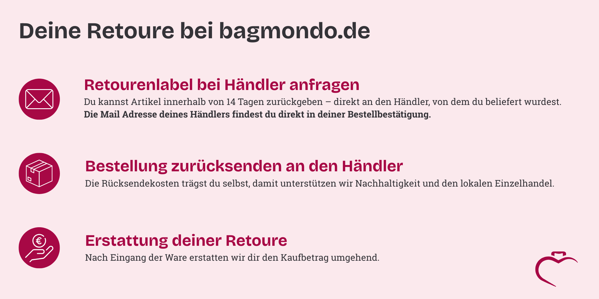 Bitte sende uns keine E-Mail an den bagmondo Support, da wir dir kein Retourenlabel ausstellen können. Stattdessen kontaktiere bitte deinen Händler, der in deiner Bestellbestätigung aufgelistet ist.